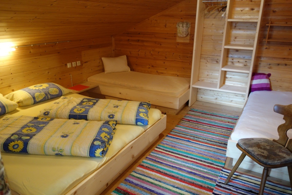 Auf den 3 Stockwerken der Holzhütte könnt ihr es euch wie folgt gemütlich machen: Im Erdgeschoss befindet sich eine sehr gut ausgestattete gemütliche Wohnküche, die zum gemeinsamen Bruzzeln und Speisen einlädt, weiters gibt es eine großzügige Terrasse mit Sonnenliegen und Brotzeittisch. Der erste Stock bietet 2 Doppelzimmer mit jeweils einem Zusatzbett und einem Vierbettzimmer, das über den Balkon erreichbar ist. Ein Stockwerk höher befindet sich noch ein Doppelbettzimmer mit Balkon. 2 Duschen, 3 Toiletten, 2 Balkone mit traumhafter Aussicht und ein Skischuhtrockner machen die Hütte komplett.